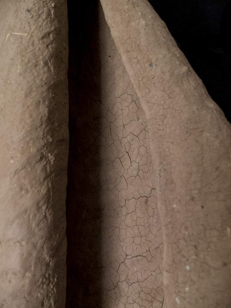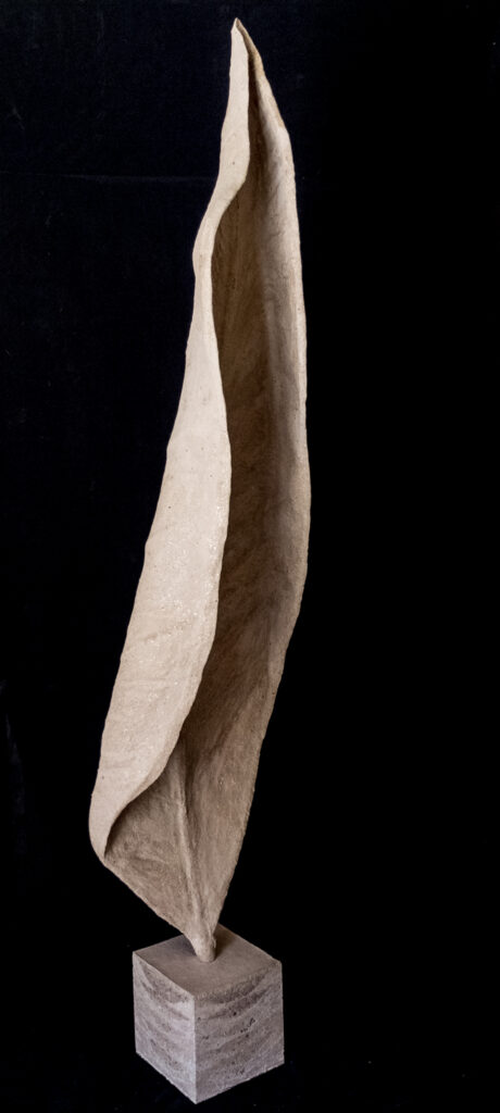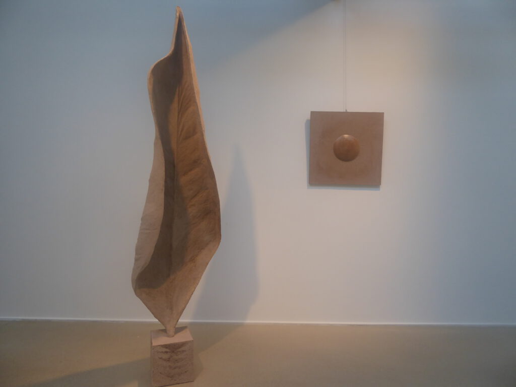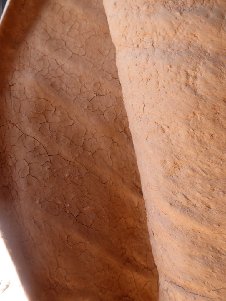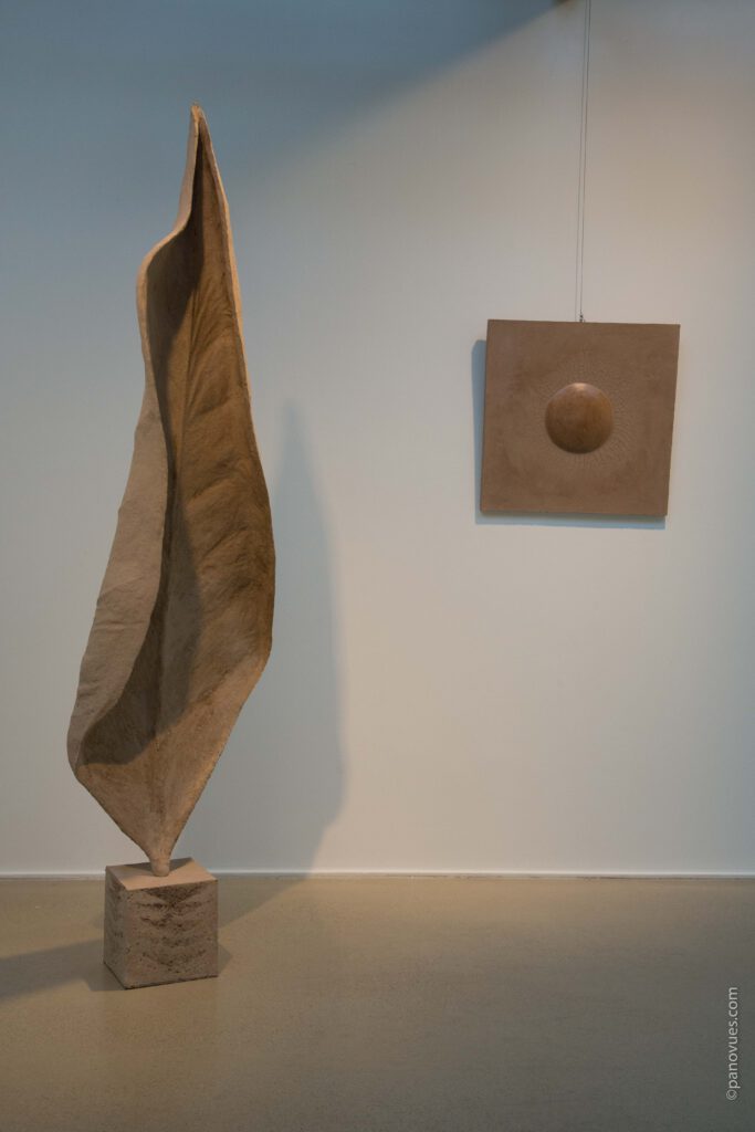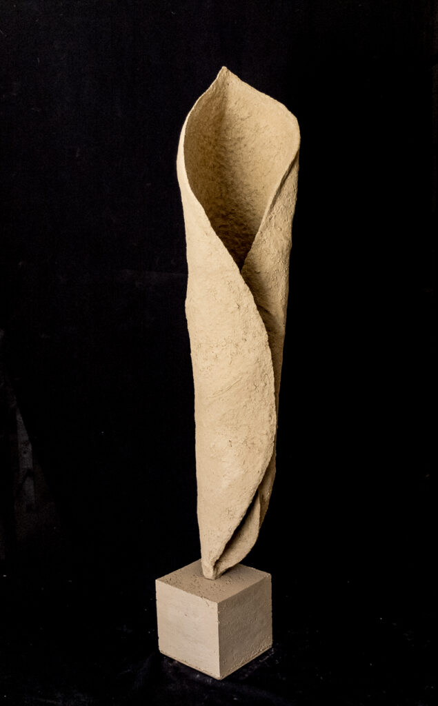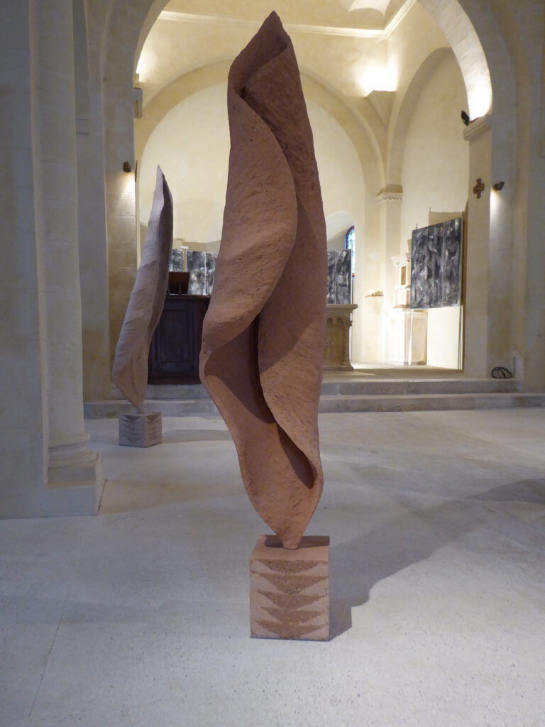 Au départ cette série est venue de l’observation de la nature. Ce sont de grandes sculptures en terre crue en formes de feuilles qui se recroquevillent sur elles mêmes, qui se torsadent, et ainsi s’installent dans le volume..