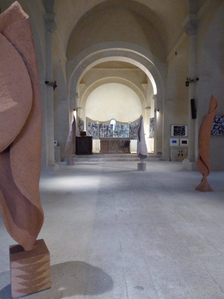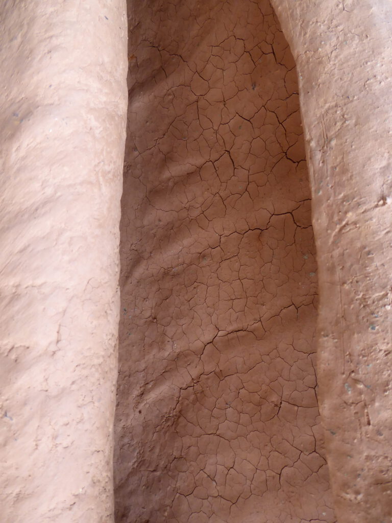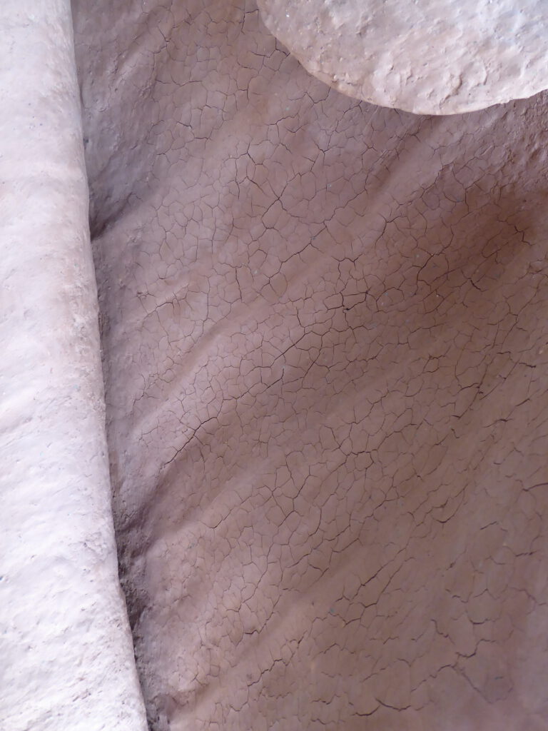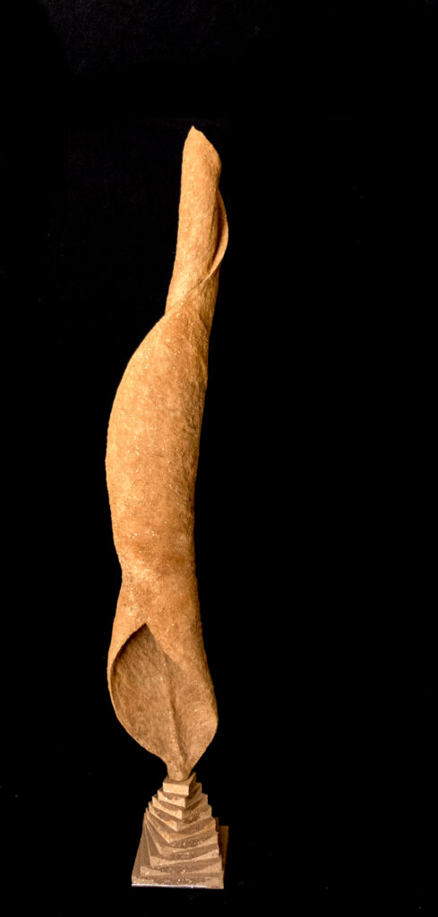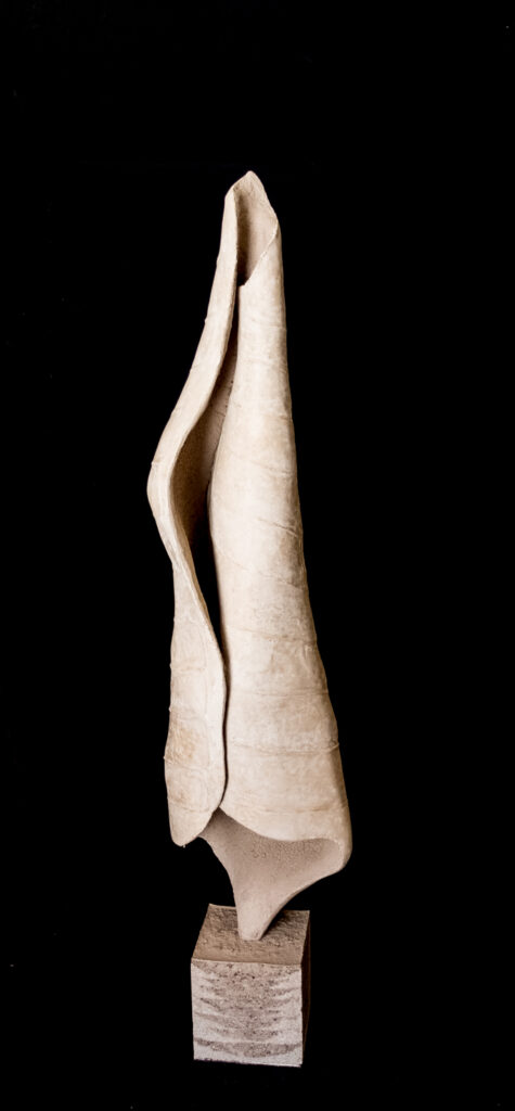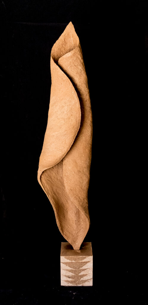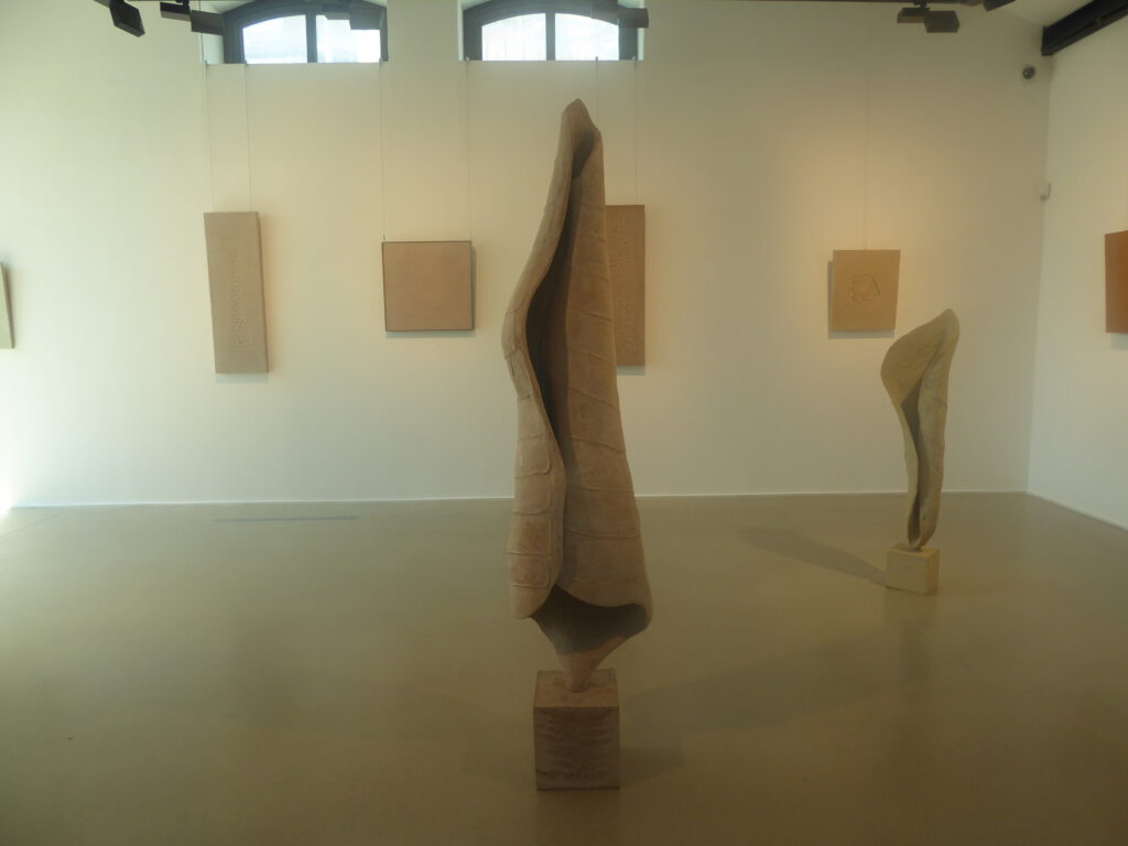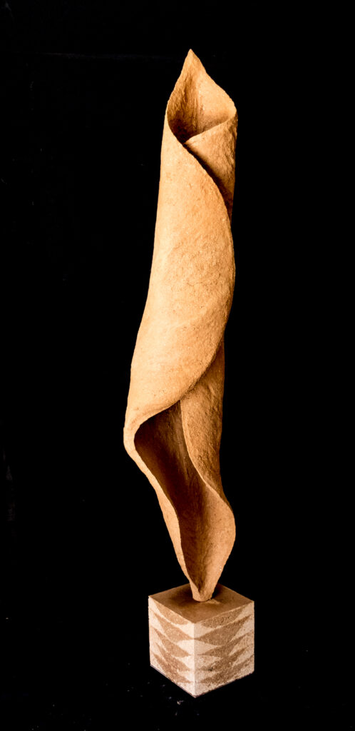 Au départ cette série est venue de l’observation de la nature. Ce sont de grandes sculptures en terre crue en formes de feuilles qui se recroquevillent sur elles mêmes, qui se torsadent, et ainsi s’installent dans le volume..