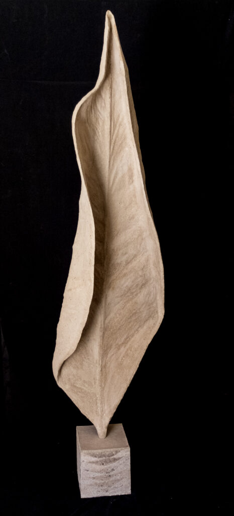 Dans le contours d’une feuille, à plat, dans la bi-dimensionnalité, il n’y a toujours que deux lignes en symétrie ; mais en se repliant sur elles mêmes, se torsadant, elles créent une infinité de volumes complexes, généreux, sensuels.